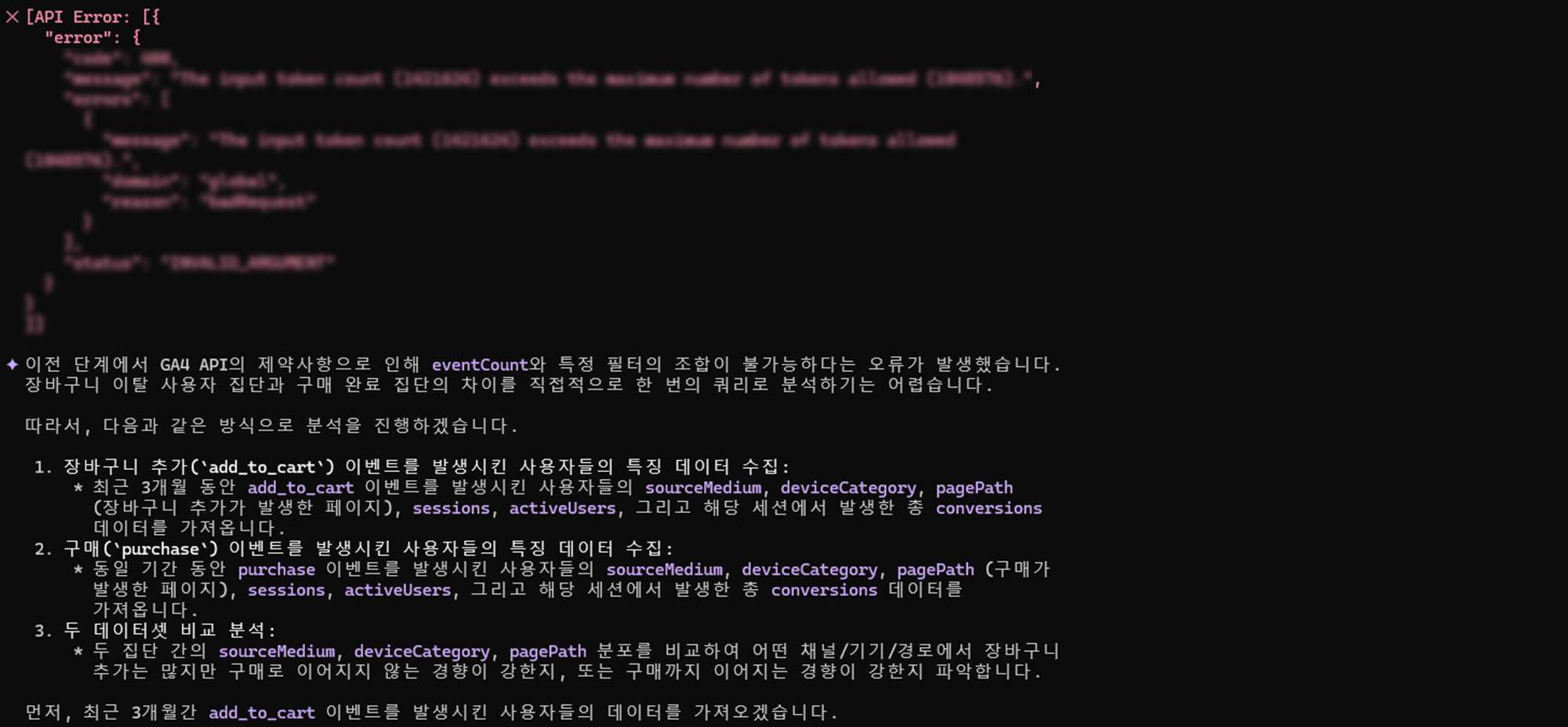 분석 중간에 API 호출 오류가 발생하였다. 분석 중간에 오류가 발생할 경우 Gemini CLI는 스스로 새로운 분석 계획을 찾아 실행한다.