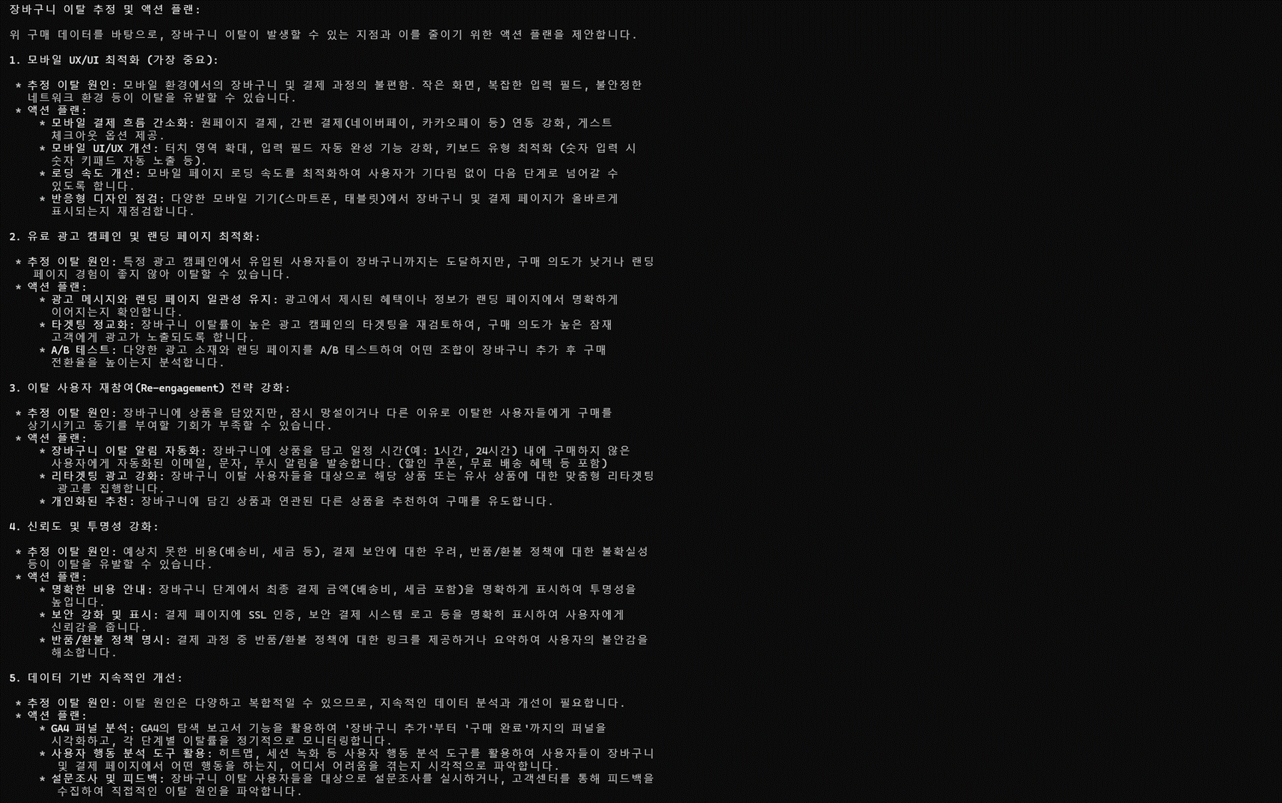 Gemini CLI에게 최근 3개월 간 장바구니 추가 후 구매를 하지 않은 사용자 집단과, 장바구니 추가 후 구매를 완료한 집단 간의 행동 패턴 차이를 분석하고 장바구니 추가 후 구매 전 단계에서 이탈하는 이탈률을 줄일 수 있는 액션플랜을 제시해달라고 요청하였다. Gemini CLI는 분석계획과 어떤 카테고리에 중점을 두고 액션플랜을 구축할건지에 대한 계획을 자세히 답변해주었다.